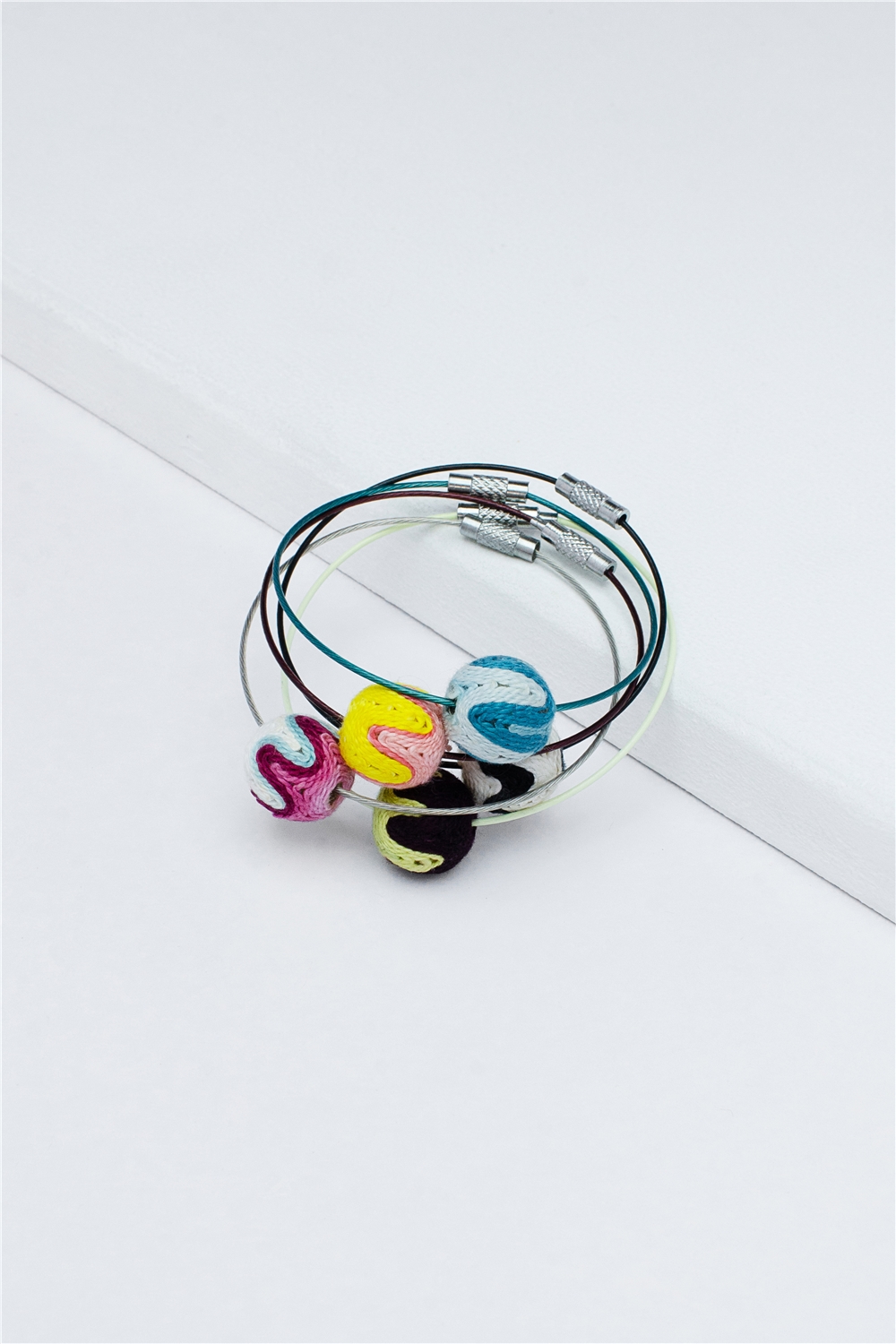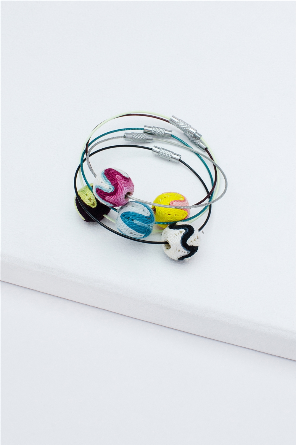 This Set of 5 Multi Coloured Bracelets features hand made thread balls beaded into individual coloured wires with a barrel closure. Stack them or wear indivually, adding a perfect pop of colour to your outfit! Please note: The colours of the threas balls may vary slightly from the picture as each thread ball is different from the other.