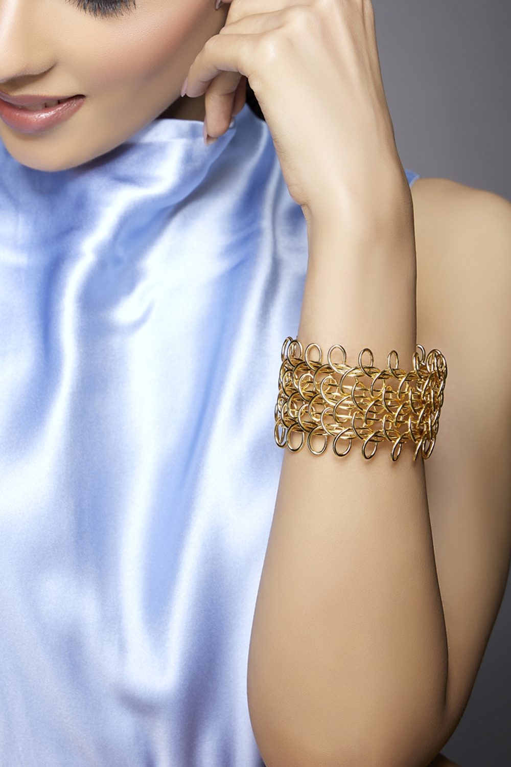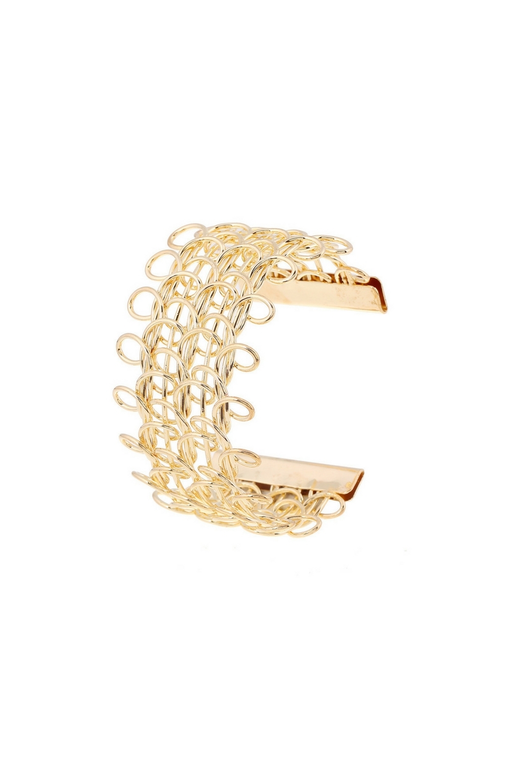 A graphic statement gold cuff in an eye-catching abstract silhouette. Perfect as your go-to signature piece. Pairs well with a boho-chic look.