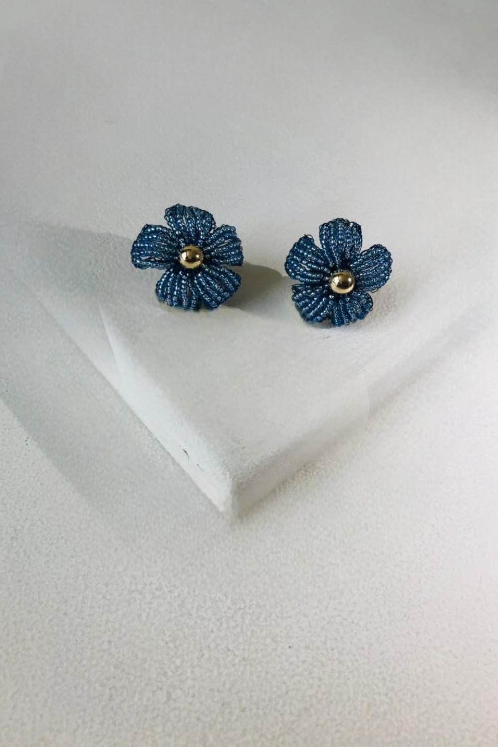Featuring a vibrant blue floral design with gold glass bead accents on a copper base, these handcrafted studs add a luxe yet playful touch—ideal for styling with festive fits or elevating everyday elegance.