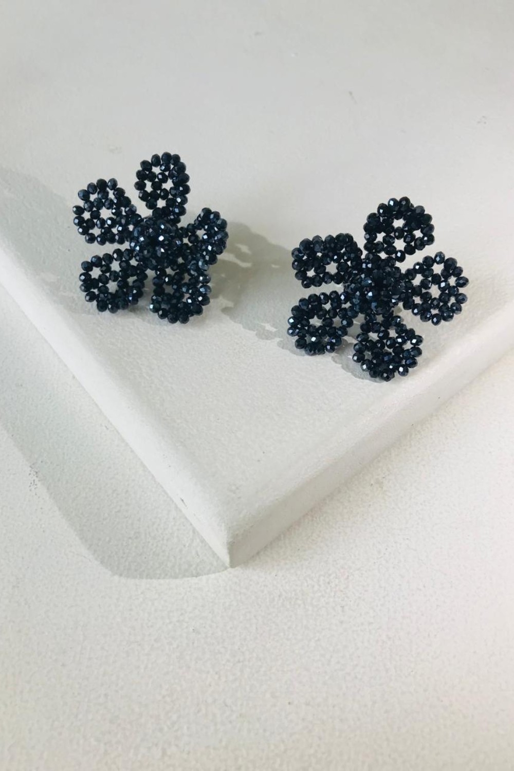 The perfect touch of drama: these striking floral stud earrings feature black and hematite-hued glass beads on a copper base, effortlessly transitioning from smart casual to formal wear.