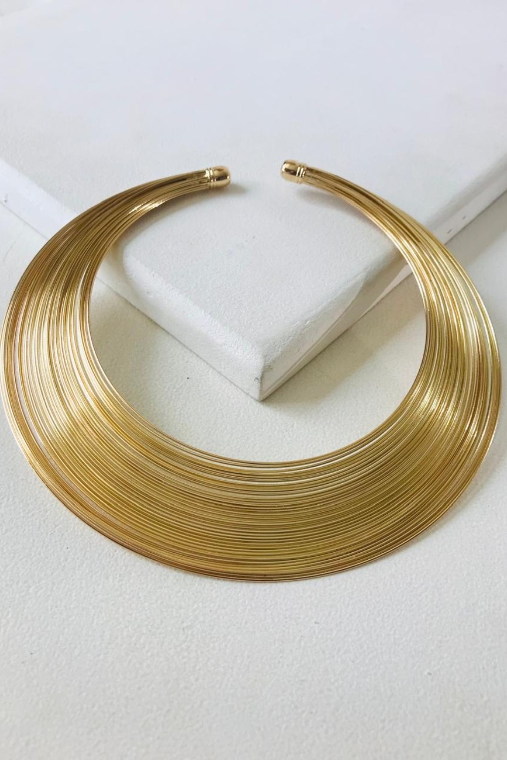 Sleek and sculptural, the Orbit Curve Necklace features layered gold-toned bands crafted from iron. A bold collar piece, it’s perfect for adding modern elegance to evening wear or a polished edge to minimalist outfits.